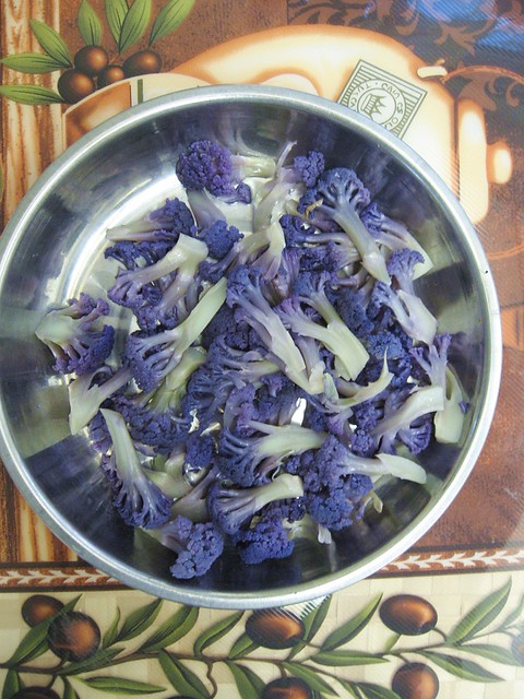 Organic cauliflower of all varieties and colors selling at $3 each in the farmer's market. How can I not grab a few including this beautiful purple one?